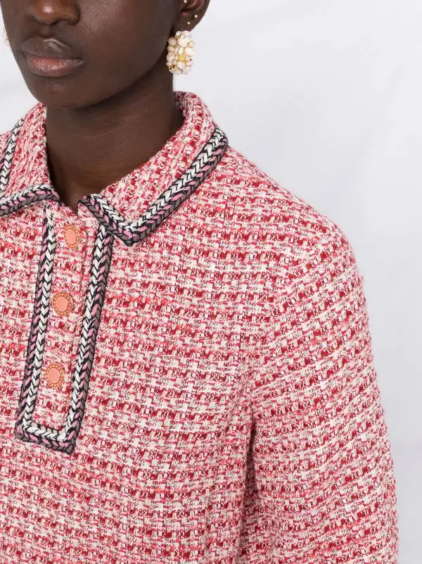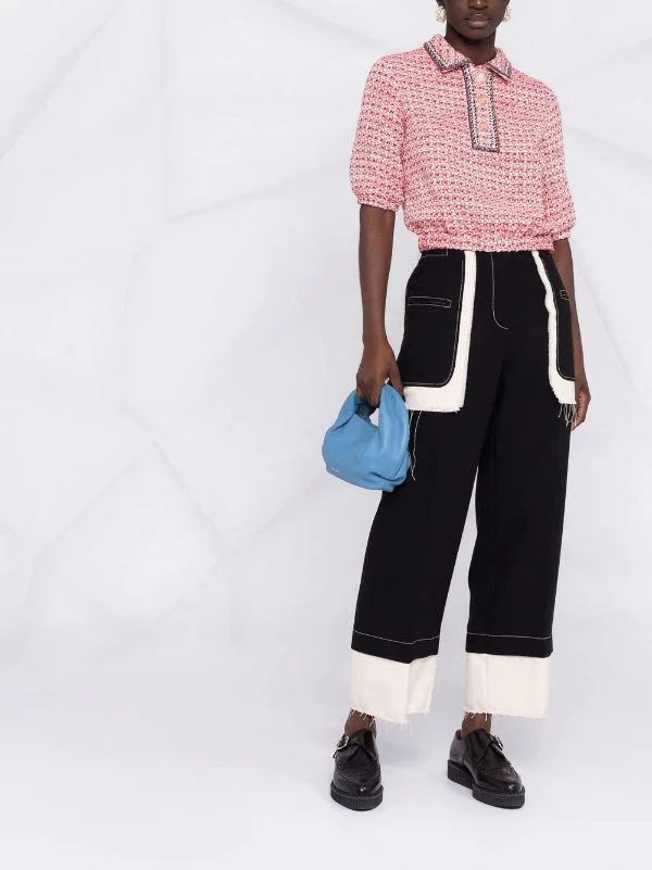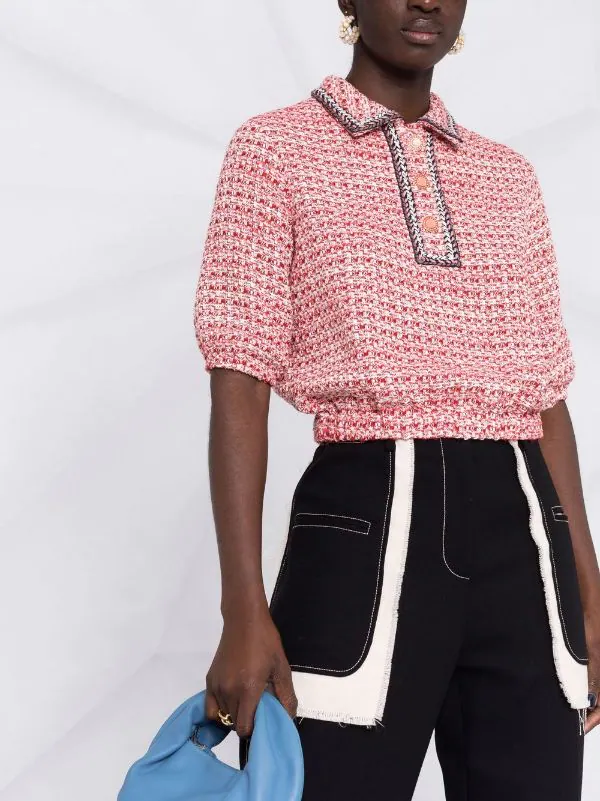 Poloshirtkragen, Knopfverschluss vorne, elastischer Saum, kurze Puffärmel. Material: Baumwollgemisch.