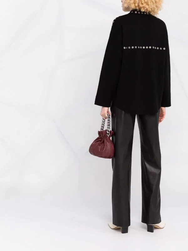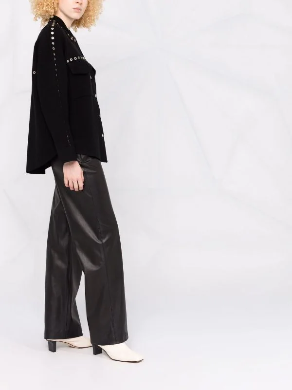Ösen, klassischer Kragen, Knopfverschluss vorne, lange Ärmel, zwei Pattentaschen an der Brust. Farbe: Schwarz.