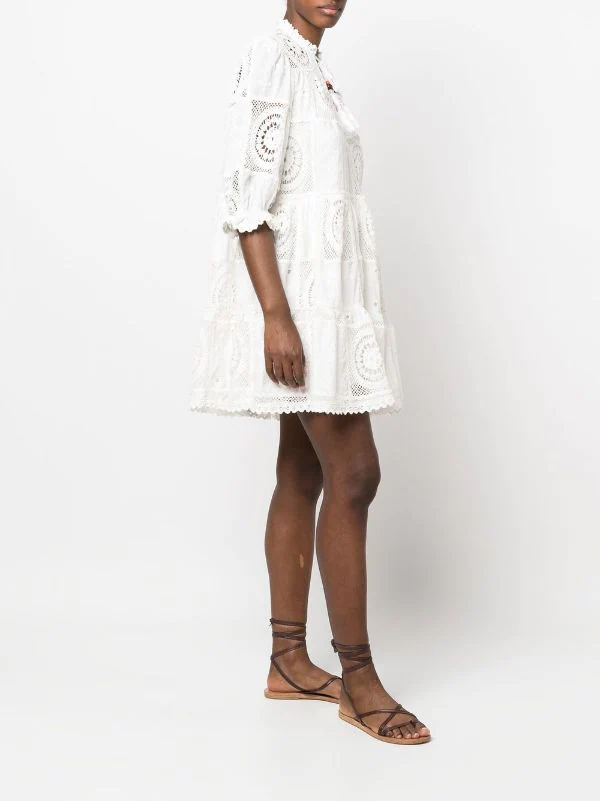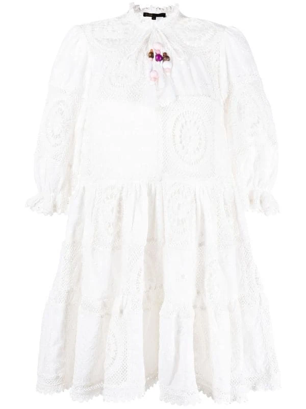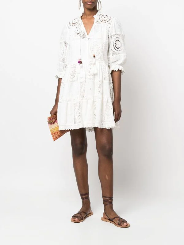 Wollweiß, Baumwolle, ausgestellte Form, Quasten, V-Ausschnitt, Cropped-Ärmel, elastische Bündchen, gewellter Saum.