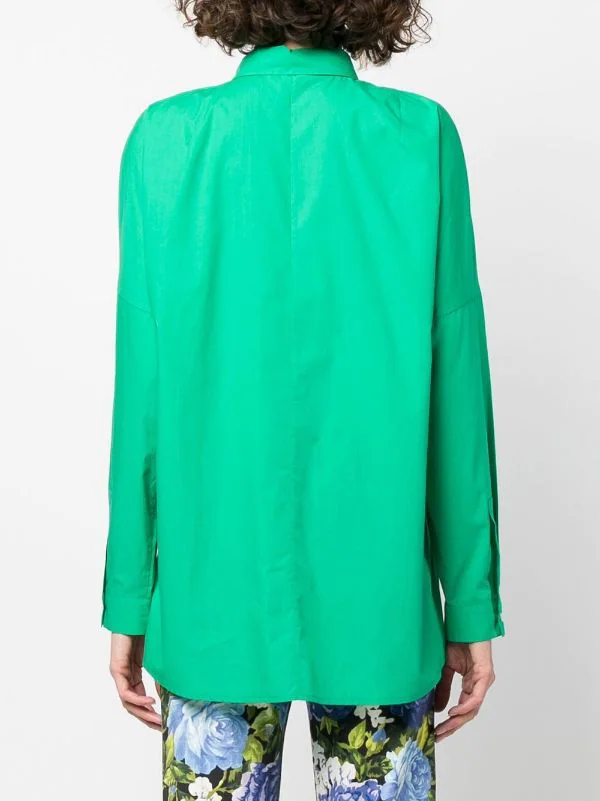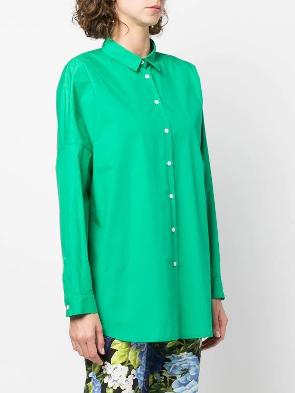 Klassischer Kragen, Knopfverschluss vorne, lange Ärmel, Knopfmanschetten, abgerundeter Saum.