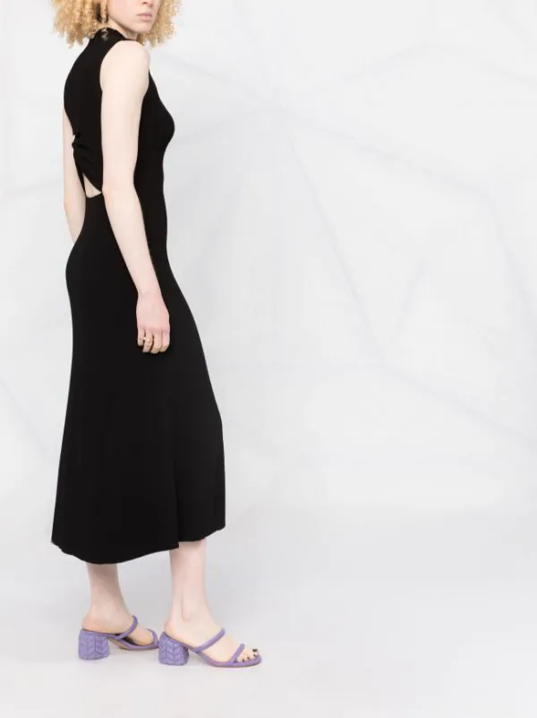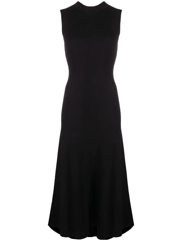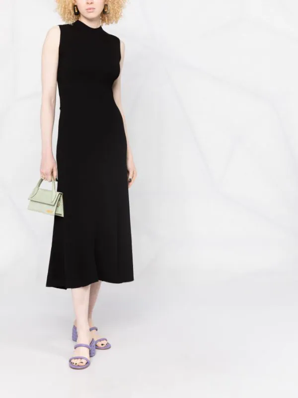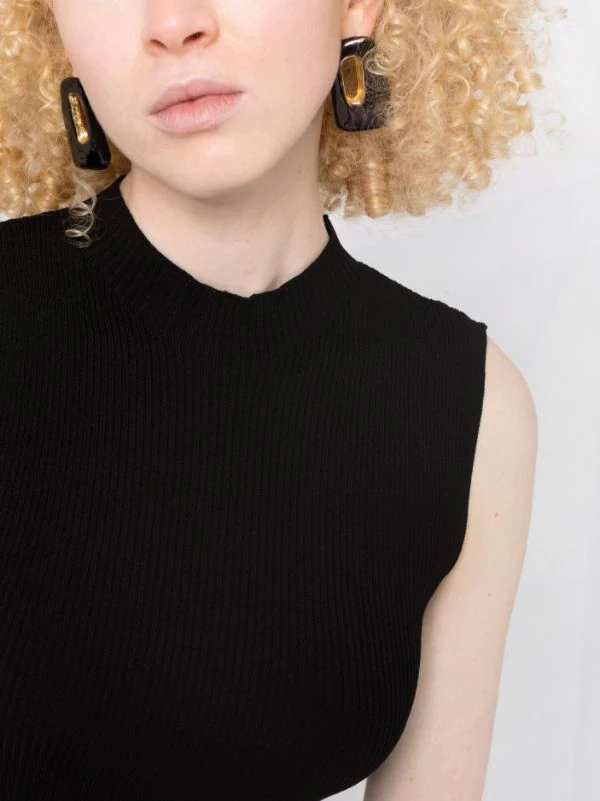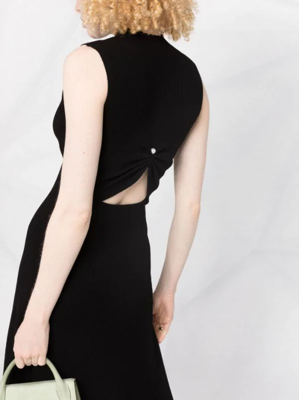 Gerippter Strick, Raffungen, Kunstperlen, gekräuselter Saum, Cut-Outs, ärmellos, kurzer Stehkragen, Midilänge. Farbe: Schwarz.