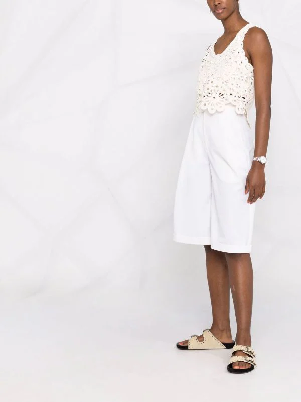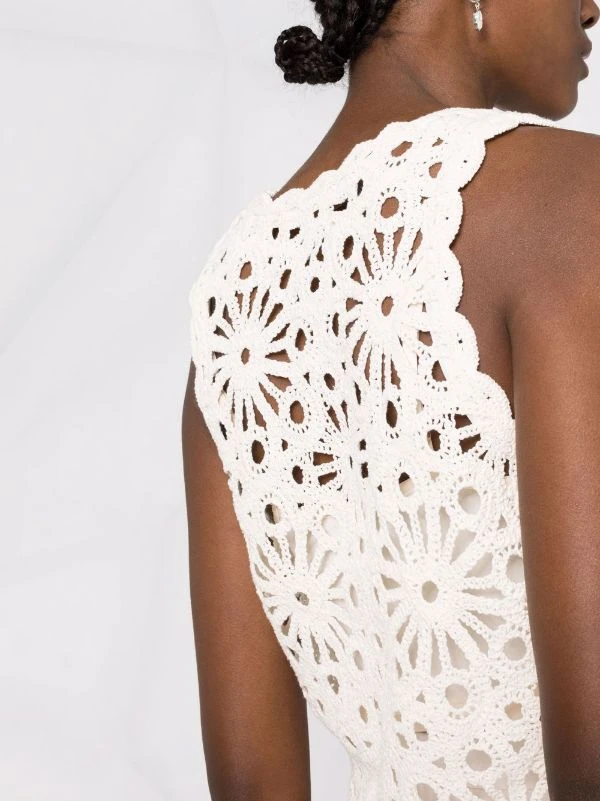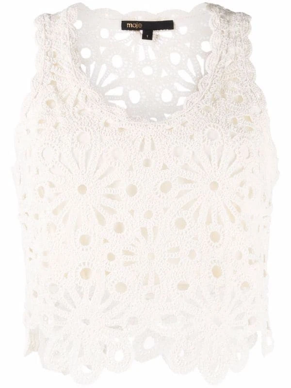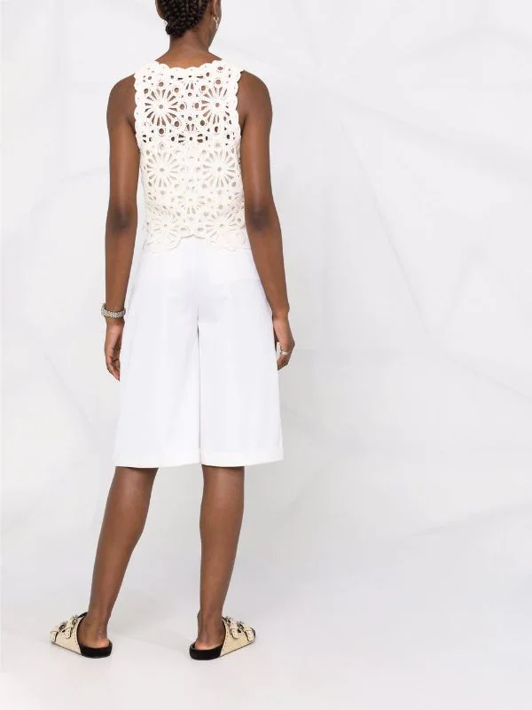 Häkelmuster, U-Ausschnitt, Wellensaum, ärmellos, semi-transparentes Design, abgerundeter Saum, Cropped-Design.