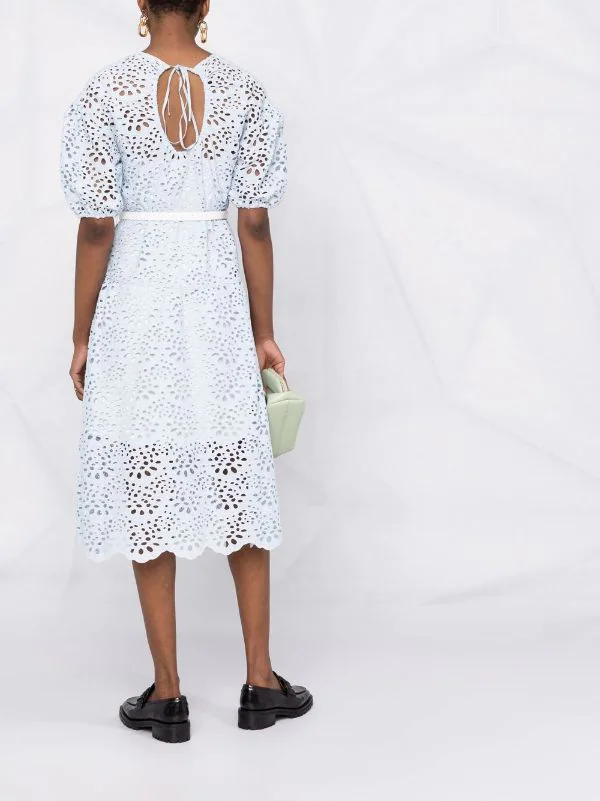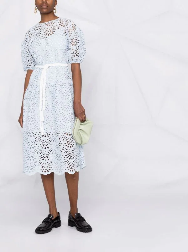 Runder Ausschnitt, Layering-Look, gegurtete Taille, gewellter Saum, kurze Puffärmel, Schleifenverschluss hinten.