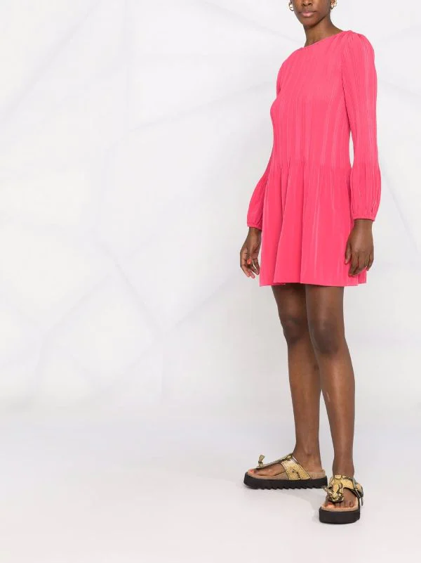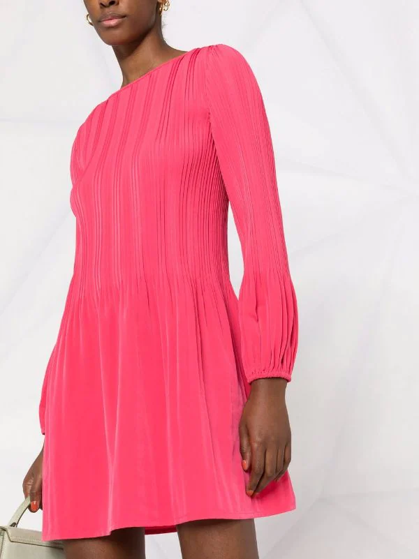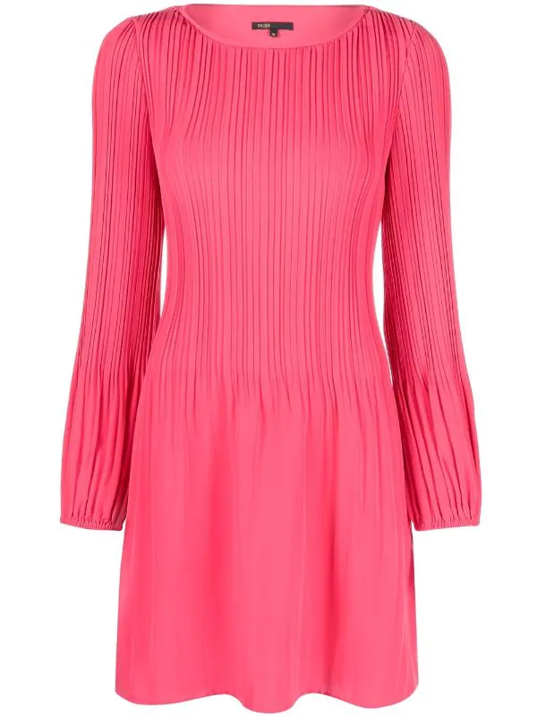 Faltendetails, runder Ausschnitt, enge Bündchen, elastische Bündchen, ungefüttert, abgerundeter Saum, über dem Knie. Farbe: Pink.
