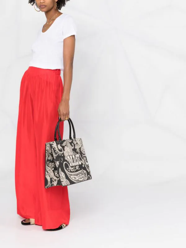 Paisley-Print, Logo-Print vorne, Logo-Patch an der Innenseite, Hauptfach, Innentasche mit Reißverschluss, oben offen, zwei runde Henkel. Material: Leder.