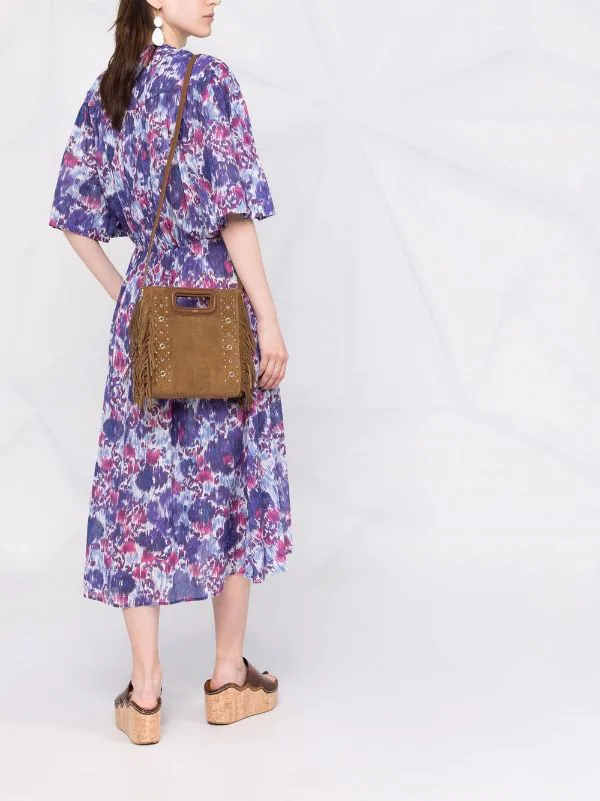 Wildleder, Fransen-Detail, silberfarbene Nieten, einzelner Henkel, Logo-Stempel vorne, abnehmbarer und verstellbarer Schulterriemen, Magnetverschluss, Hauptfach. Material: Leder.