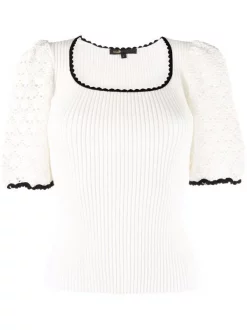 Maje zeigt seine Strickkünste für FS22 mit diesem weißen, fein gerippten Oberteil, das mit reizvollen, dekorativen Häkelärmeln akzentuiert ist. Ein kontrastierender schwarzer Saum sorgt für den letzten Schliff.