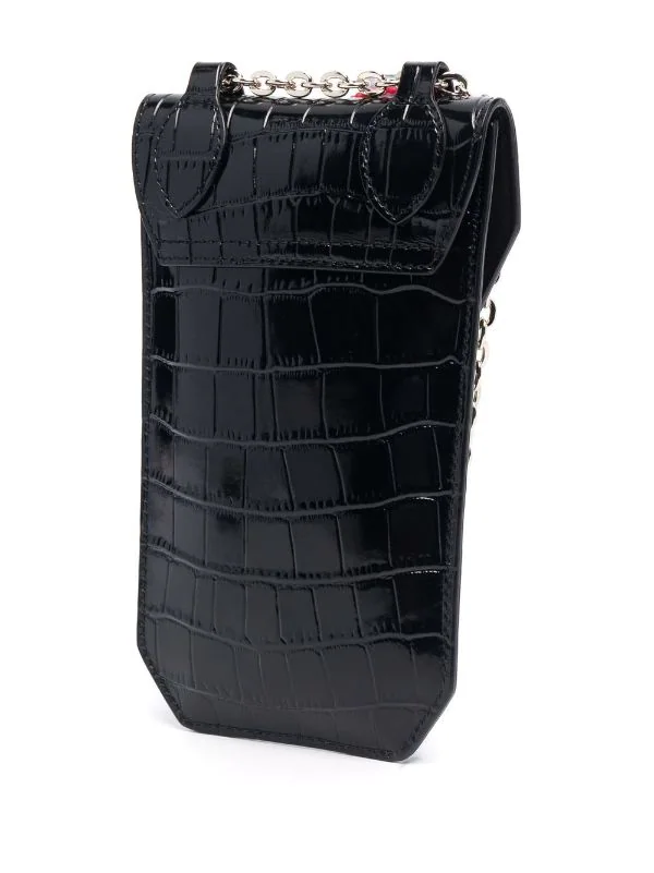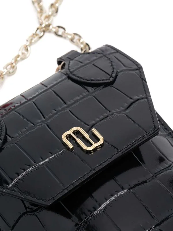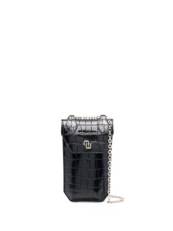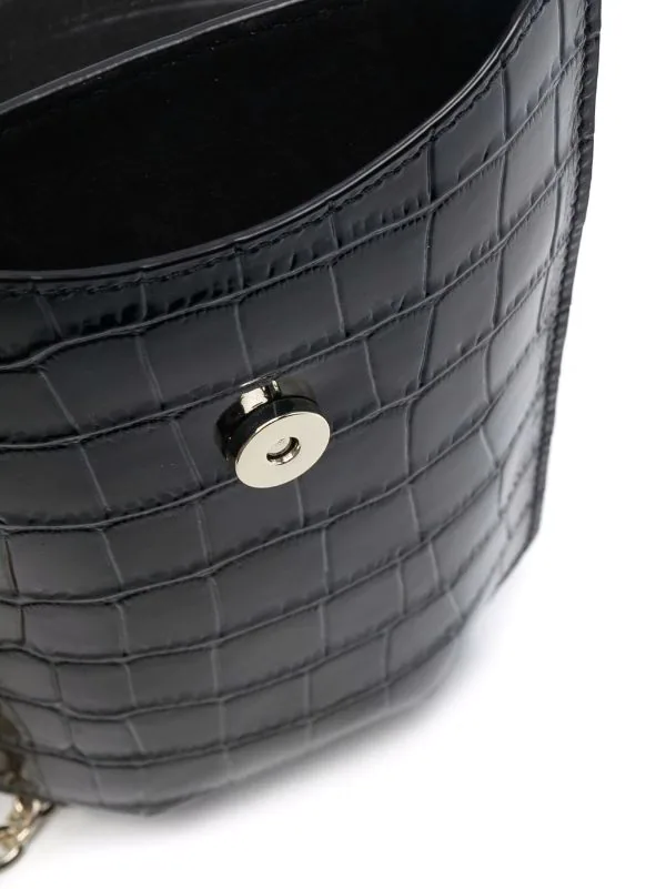 Kroko-Effekt, goldfarbenes Logo-Schild, Klappe mit Magnetverschluss, Hauptfach, Schulterriemen mit Kette. Farbe: Schwarz. Material: Kalbsleder.