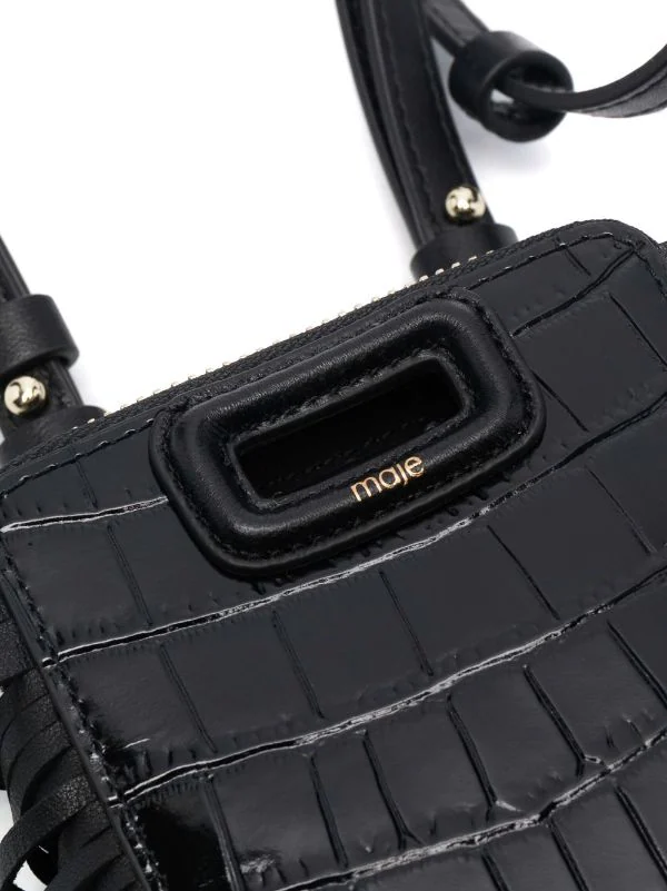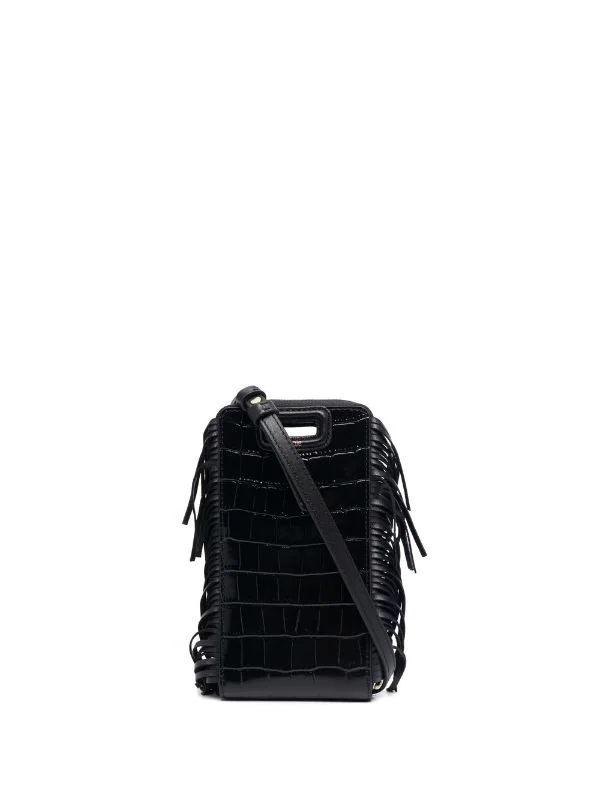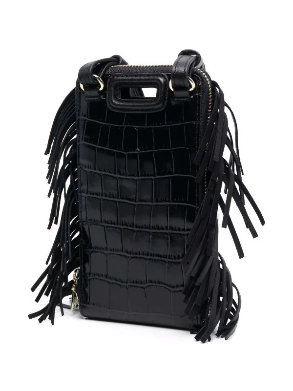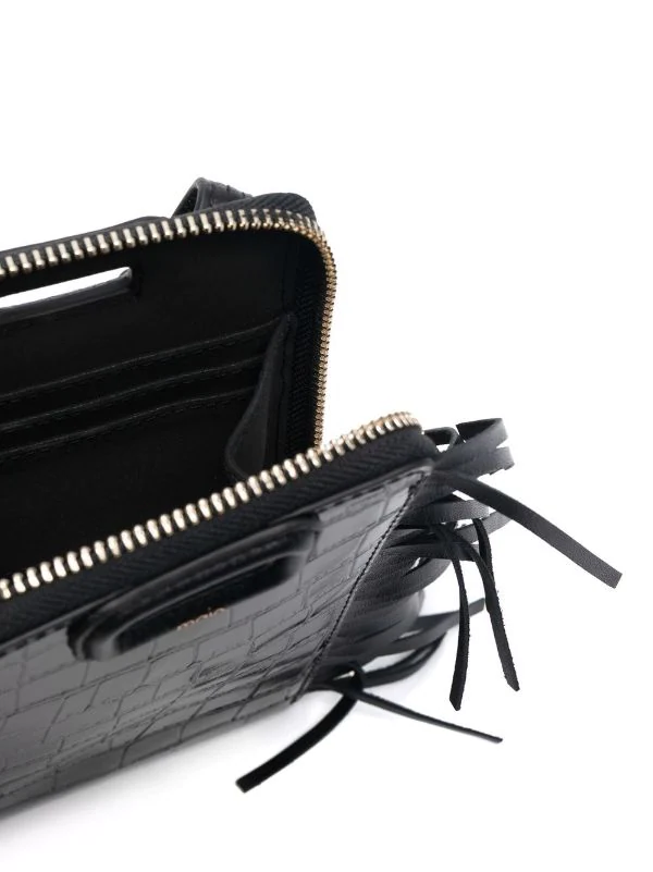 Kroko-Effekt, eingestanztes Logo, Fransen-Detail, Reißverschluss oben, Hauptfach, Kartenfächer innen, abnehmbarer und verstellbarer Schulterriemen. Farbe: Schwarz. Material: Leder.