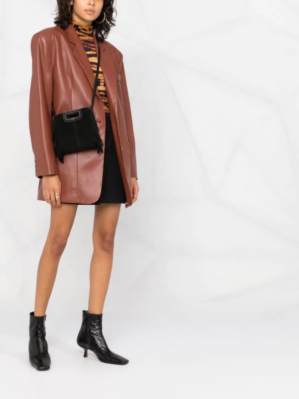 Ausgefranste Kanten, Logo-Print vorne, Hauptfach, Cut-Out-Henkel, Schulterriemen mit Kette. Farbe: Schwarz. Material: Leder.
