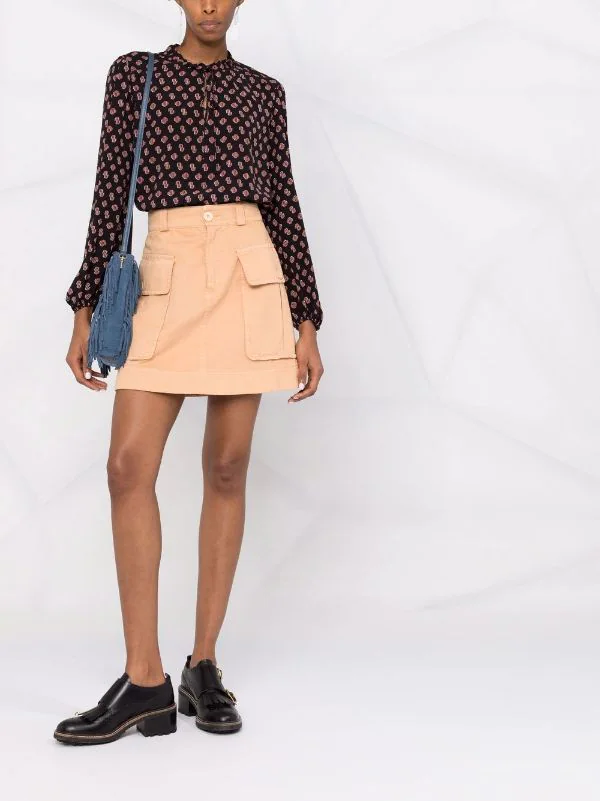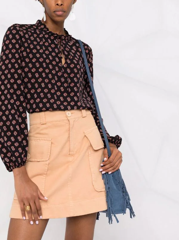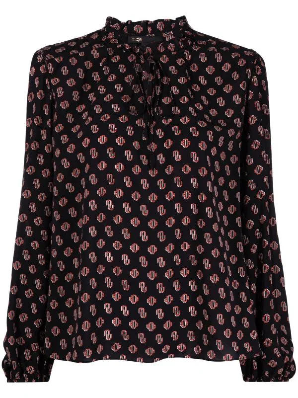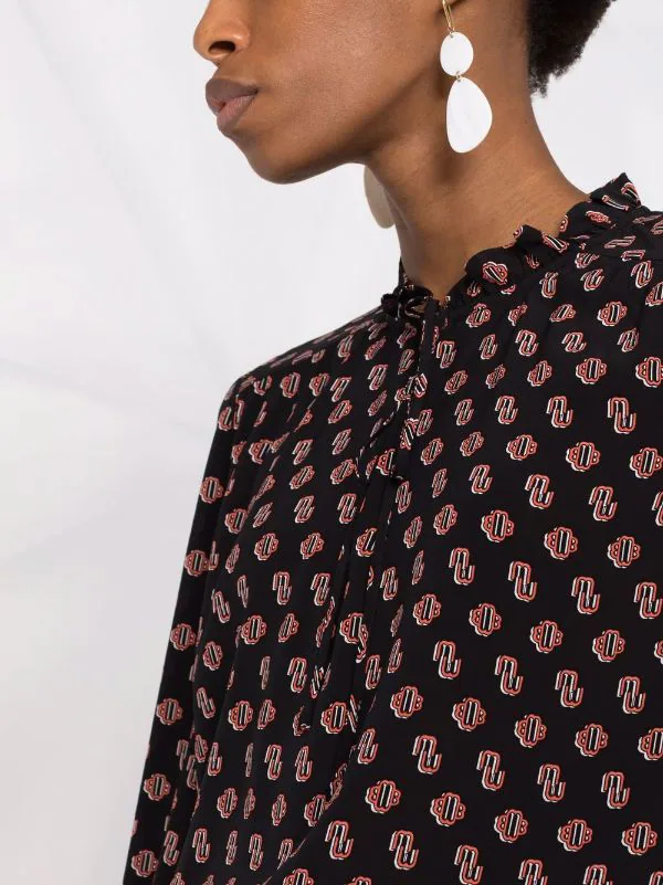 Monogramm-Print, Schlüssellochausschnitt, lange und weit geschnittene Ärmel, gerader Saum.